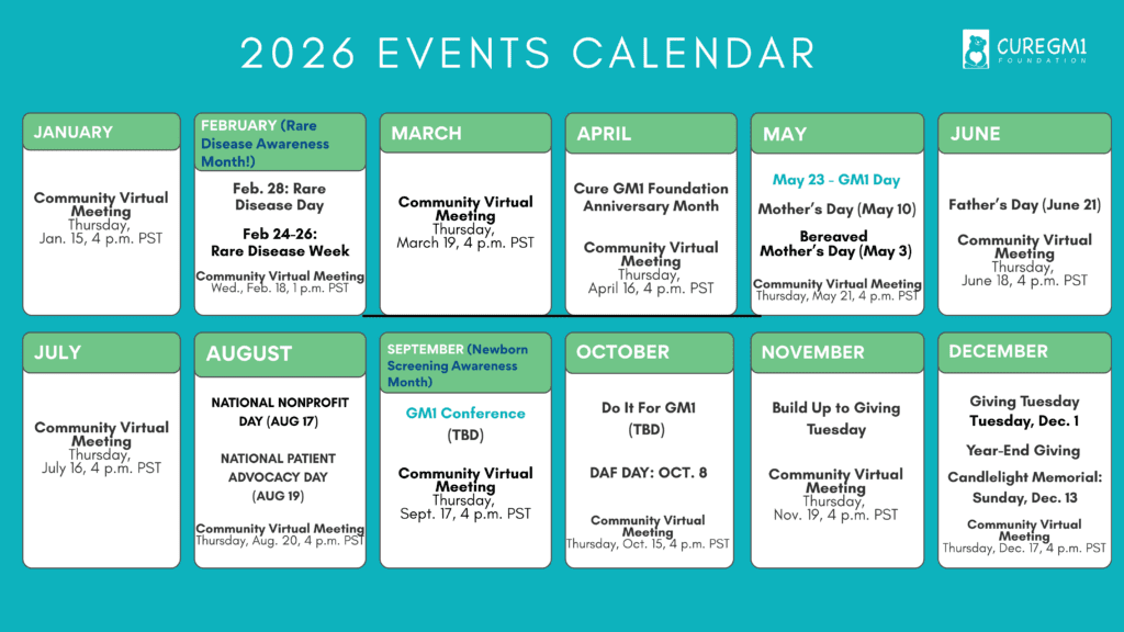 Don’t forget to check our new 2026 annual calendar and plan ahead our major events and dates, including opportunities to advocate on behalf of those living with GM1. Click here to download a printable version of the 2026 calendar now.